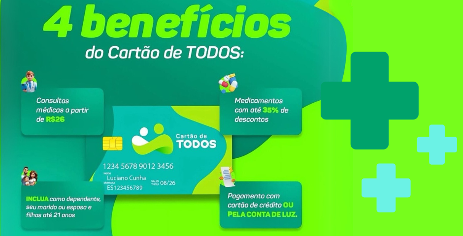 O Cartão de Todos é um cartão de descontos que facilita o acesso a serviços de saúde, educação e lazer.