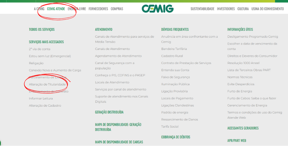 Na Cemig, basta acessar o site, ir em “Cemig Atende” e depois em “troca de titularidade”
