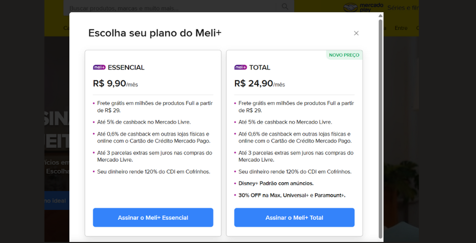 Meli+ Total | R$ 27,99 | Todos os benefícios do plano Essencial + Disney+ Padrão, Deezer Premium por 12 meses, 30% de desconto no HBO Max e Paramount+. |